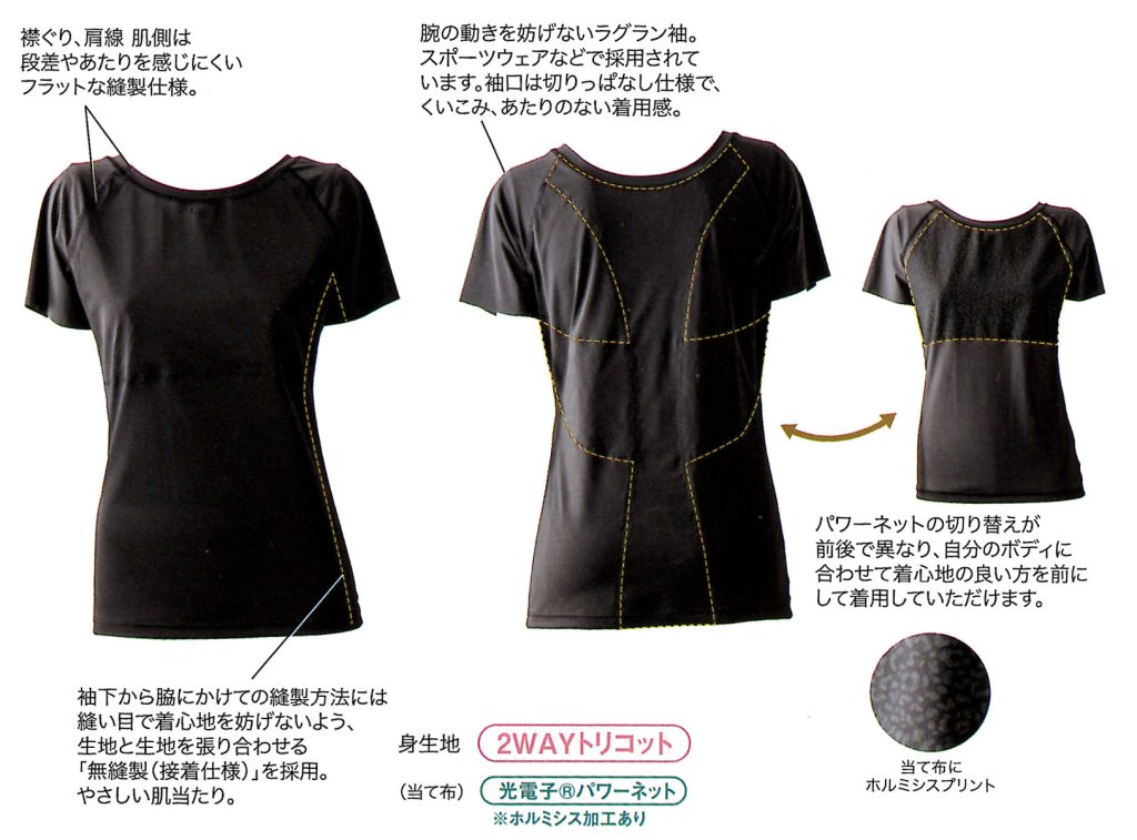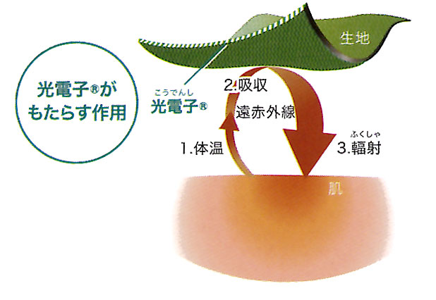 光電子繊維は自分の体温を利用し、遠赤外線を輻射します。遠赤外線の保温作用により、体を冷やすことなく環境に適応する体温リズムをサポートします。また、衣類内の温度や温度をコントロールし、ムレにくく、一年中快適な高機能素材です。