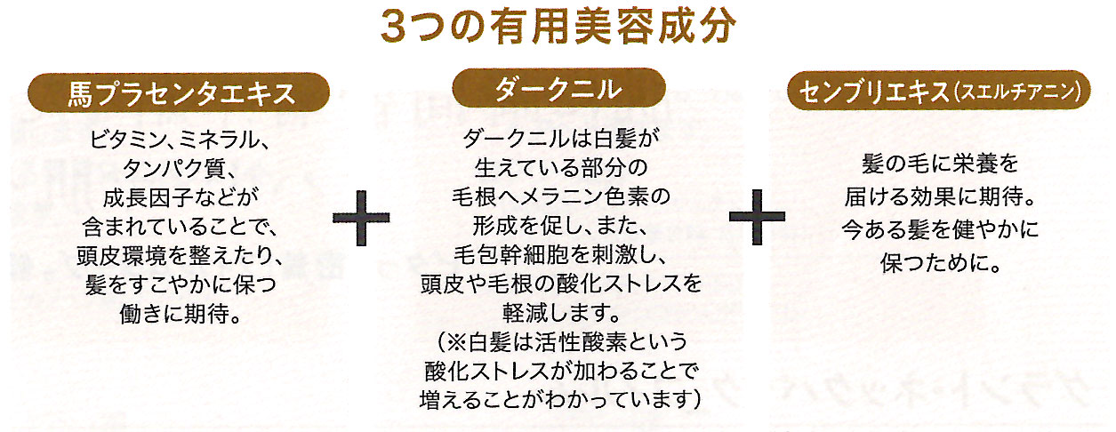 馬プラセンタエキスにはビタミン、ミネラル、タンパク質、成長因子などが含まれています。頭皮環境を整えたり、髪を健やかに保つ働きが期待できます。